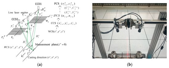 The schematic illustration of the binocular CCD laser image scanning system. (a) The schematic working principle diagram; (b) The corresponding devised experimental system.