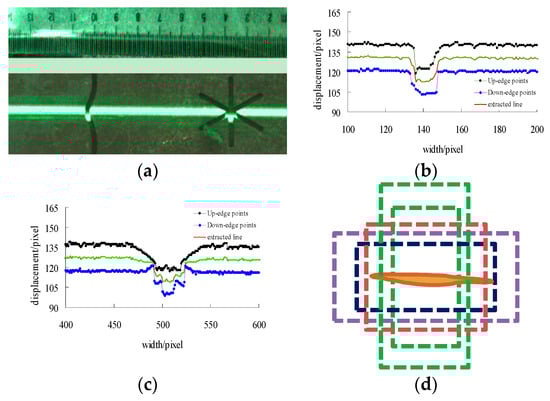 Figure 12 denotes the ROI depth location method. For abnormal depth areas we only extract the centroid line as the position depth values and 3D image reconstruction in scanning process. Figure 12a is the artificial defect that for convenience of calculation we made some samples of different depths and sizes for four defect types and others (made randomly). Figure 12b,c are the laser location process that pixels offset reflected on the image. Figure 12d is the ROI depth based candidate bounding box generation method.