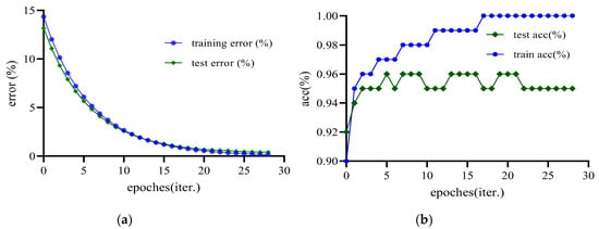 Validation on model training and testing; (a) Training and testing errors; (b) ACC results on training and testing data sets.