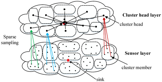 To ensure the success of sparse sampled data gathering without waking up all nodes, a sparse sampling data gathering scheme is proposed in clustered WSNs. In clustered WSNs, all nodes are divided into multiple clusters, and each cluster contains one cluster head (CH) and a number of cluster members (CMs). The cluster head is selected for each round to communicate with the sink, and the cluster members only communicate with CHs in their clusters. The proposed sparse sampling data gathering scheme based on clustered WSNs is shown in Figure 1. For clarity, nodes are divided into two layers: sensor layer containing CMs in each cluster and cluster head layer containing all CHs. Sparse sampling is adopted for CMs in each cluster, that is, only partial CMs wake up and transmit the sensed data to the CH. The CHs transmit the received data and its own sensed data to the sink. It is worth noting that several CHs which locate far from sink node can communicate with sink using multi-hop transmission. For simplicity, only direct communication between CHs and the sink is illustrated in Figure 1.