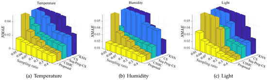 As shown in Figure 3, the proposed method achieves the lowest NMAE with each sampling ratio for all attributes. With the decrease of sampling ratio, the performance of other three methods degrades dramatically while the proposed method keeps satisfying performance. Even with the sampling ratio as low as , the proposed method obtains NMAE for temperature, humidity, and light data, respectively.