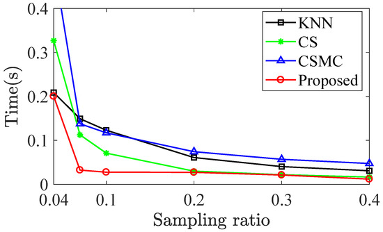 Figure 4 shows the running time performance of methods for temperature data in GreenOrbs. The average running time of KNN, CS, CSMC, and the proposed method is graphically represented. As shown in Figure 4, the proposed method achieves the lowest running time. The reason is that the proposed method avoids the singular value decomposition (SVD) in (6). For traditional matrix completion methods, the main computational complexity is from the SVD of EM for each iteration, and exact SVD of a matrix with size has time complexity . In the proposed subspace approach, the SVD is used to obtain the subspace from previous reconstructed data . The calculation only needs to be run once and can be done between two time slots. Then the computational complexity in each iteration to solve (6) is negligible.