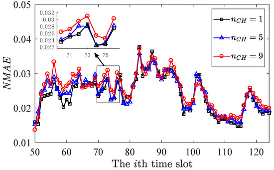 Despite the reduction in the recovery accuracy of the proposed method for long-term reconstruction, the overall reconstruction accuracy is still satisfying. The average NMAE is for the proposed method with cluster heads, respectively. It is obvious that less number of cluster head leads to lower NMAE. With a fixed number of CH, only sampling nodes are randomly selected while nodes are fixed. As a result, if , all sampling nodes are randomly selected, which can achieve better recovery.