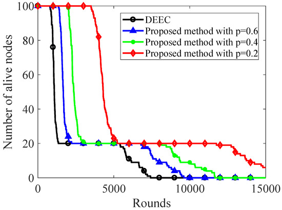 In the simulation, a two-level heterogeneous network containing advanced nodes and normal nodes was utilized. The initial energy of normal node was , and the initial energy of advance node was . There were 100 sensors (80 advanced nodes and 20 normal nodes) randomly distributed in a area and one sink located in the center of the area.