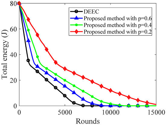 To keep 50% nodes alive, the original DEEC can only carry out 1081 rounds. The proposed method with can carry out 4300 rounds, which is about 4 times than that of original DEEC. As the sampling ratio decreases, more network nodes can keep alive after a fixed number of rounds. As shown in Figure 7, the total energy of network decreases slowly using the proposed sparse sampling data gathering scheme. When the sampling ratios are 0.2, 0.4, and 0.6, the total energy of the proposed method is 33.9J, 24.55J, and 20.46J, respectively, while the original DEEC only had 14.1J at the 4000th round. To keep 20% total energy, the original DEEC can only carry out 3692 rounds, while the proposed method with can carry out 8829 rounds. It is obvious that the proposed method can reduce the energy consumption significantly compared with the original DEEC.