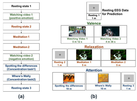 The overall experimental procedure is presented in Figure 1a. We designed the experimental protocol such that the three EEG features (valence, relaxation, and concentration) were investigated in a single experiment. Two different video clips were played to induce positive and negative emotions while recording the EEG signals, with the video clip that aroused positive emotion being played first. Experimental sessions investigating relaxation-related EEG features (denoted by meditation sessions) were added between the plays of positive and negative video clips as negative videos can potentially influence the following meditation sessions because of their contents being too intense for some participants. The sessions related to attention were allocated at the end of the experimental procedure because attention is relatively less dependent than meditation on the valence of the participants.
