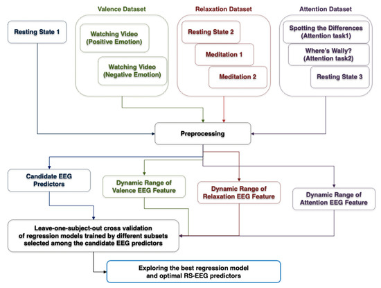 Figure 2 shows a flow chart showing the overall data analysis procedure. Four EEG datasets were used, including the first RS-EEG dataset (denoted by resting-state 1), the valence dataset, the relaxation dataset, and the attention dataset. The same preprocessing steps were applied to the four EEG datasets except for the attention dataset (the details are described in Section 2.4). After preprocessing, a number of candidate predictors of EEG dynamic ranges were evaluated from the preprocessed “resting state 1” dataset. The actual EEG dynamic ranges of each participant during different mental conditions were evaluated from his/her valence, relaxation, and attention datasets. Finally, a variety of regression models were constructed using different features selected among the candidate RS-EEG predictors and their performances were compared using the leave-one-participant-out cross-validation (LOOCV) scheme, resulting in the best regression model and the optimal RS-EEG predictors. The detailed signal processing procedures are explained in the following sections (Section 2.4, Section 2.5, Section 2.6 and Section 2.7).