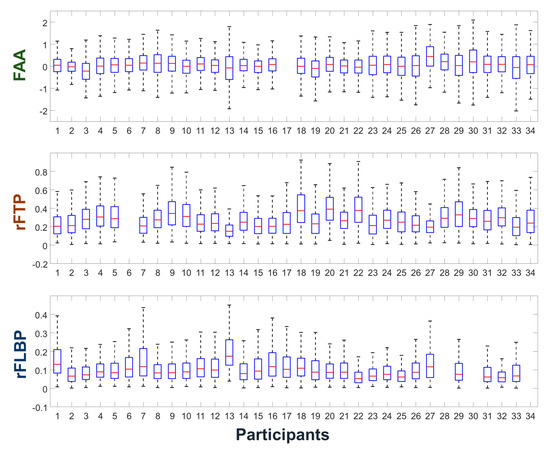 Boxplots showing the dynamic ranges of the individual participants’ frontal alpha asymmetry (FAA), relative frontal theta power (rFTP), and relative frontal low beta power (rFLBP) features. The vertical length of each box corresponds to the interquartile range (IQR) of each feature.