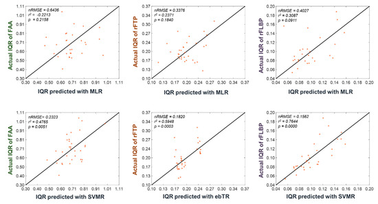 Scatter plots for the predicted and actual IQRs of three EEG features (FAA, rFTP, and rFLBP), obtained using multiple linear regression (MLR) (first row) and the best regression models (second row), respectively. Note that the IQR is the height of the box in the boxplots depicted in Figure 3. Each point (x, y) represents a participant’s predicted and actual IQRs after leave-one-participant-out cross- validation (LOOCV) application. Therefore, a point on the line y = x implies the perfect prediction of the dynamic range of the EEG feature. nRMSE, R-squared, and p-value values are provided at the top-left corner of each panel.