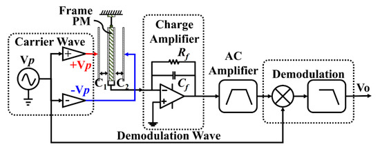 A diagram of a typical capacitive transducer is shown in Figure 1, including carrier wave modulation, charge amplifier, alternating current (AC) amplifier, and demodulation [16]. Vp is a carrier wave to modulate the capacitance variation signal, which is generally a high-frequency sine wave or square wave. For a capacitive sensing accelerometer, differential electrodes can be designed to eliminate the common mode noise. As a moving plate, both sides of the proof mass (PM) are coated with gold. The PM and the left-side and right-side fixed capacitance plates form a pair of differential measurement capacitances, C1 and C2; they are equal when the PM stays at the balance position. Once an external acceleration is applied to the frame, there is a movement of the PM. Thus, a capacitance difference ΔC = C1 − C2 is formed, which indicates the external acceleration. A pair of carrier waves, which are +Vp and −Vp with equal amplitude and opposite phase, are injected into the two fixed plates. Therefore, the differential capacitance ΔC information is converted to voltage information and picked up by the charge amplified by Vcharge [17].