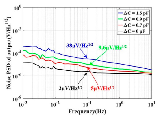 A larger differential capacitance ΔC resulted in a worse output noise at 0.1 Hz. Meanwhile, the noise was higher than the background noise, as shown in Figure 2. As a result, we can preliminarily conclude that the output noise of the capacitive transducer was mainly from the carrier wave in our concerned frequency.
