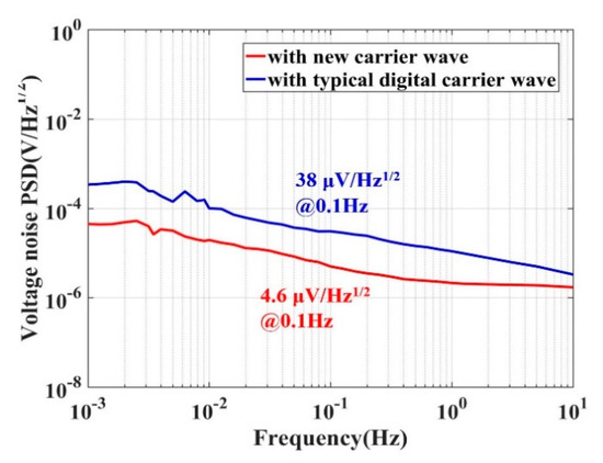 In Equation (6), it can be seen that the amplitude noise of the carrier wave also limits the dynamic range. Generally, the stability of voltage magnitude would be 100–120 dB in our concerned frequency range, which makes it the key constraint on the dynamic range.