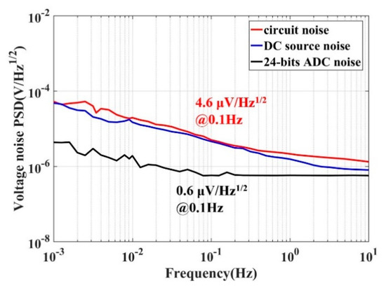Comparing the noise of the voltage reference and the capacitive transducer at 0.1 Hz with the same maximum output of 5 V. The red line comes from the capacitive transducer and the blue one is caused by the DC source being kept constant at 4.6 μV/Hz1/2 at 0.1 Hz. The black line is the background noise of the 24-bit analog-digital converter (ADC).