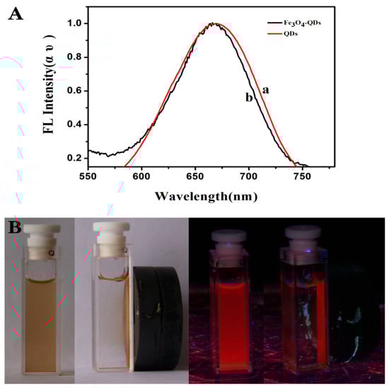 In order to verify whether the CdTe/CdS QD were successfully coupled on the magnetic microspheres, the DMFN were characterized using the fluorescent spectrometer and TEM. As presented in Figure 1, it can be seen from Figure 1A that the fluorescent spectrum of DMFN were similar to independent CdTe/CdS QD. It had a narrow and symmetrical fluorescence spectrum with the highest peaks at 680 nm when the exited wavelength was 380 nm. Furthermore, the DMFN could quickly be gathered when the magnet was near the side of the cuvette and showed strong red PL under the UV lamp (Figure 1B). It indicated that the CdTe/CdS QD were successfully adsorbed onto the magnetic microspheres and that the difunctional magnetic fluorescent probe was synthesized with obvious fluorescence intensity and magnetism.