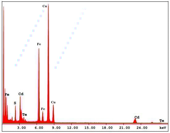 In order to further verify the CdTe/CdS QD were successfully adsorbed on the magnetic microspheres, the energy dispersive spectrum (EDS) analysis of the DMFN was conducted (Figure 3). It can be seen in Figure 3 that O, Fe, S, Cd, and Te elements were present on the DMFN, and the peaks of Cu element came from the copper grid during the detecting. These results show that CdTe/CdS quantum dots were successfully adsorbed on the magnetic microspheres and that the bi-functional magnetic fluorescent probe was successfully synthesized.