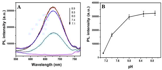 In order to improve the experimental sensitivity, a series of Tris-HCl buffer solutions with different pH values were measured through fluorescence spectra. As shown in Figure 4, the fluorescence intensity of DMFN was increased in the range of pH values from 7.1 to 8.9 in the etching reaction (Figure 4B), and the DMFN exhibited a relatively high intensity at pH 8.5, so the optimum pH 8.5 was chosen to use in the experiment.