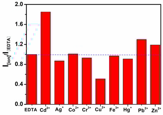 Currently, methods to detect Cd2+ include atomic absorption spectrometry (AAS) [], atomic fluorescence spectrophotometry (AFS) [], inductively coupled plasma mass spectrometry (ICP-MS) [], voltammetry [,,], and the fluorescence sensor method [,,]. To solve sample pretreatment, some research groups have been developing the high detection of Cd2+ combining magnetic separation [,,,]. Especially, the advantages of the fluorescence sensor methods are speed, visuality, and high sensitivity. Up to now, the multifunctional fluorescent probe has attracted attention in current studies due to its speed, high sensitivity, and multi-modal detection, and it has been widely applied in fields such as biomedicine and analytical chemistry.
