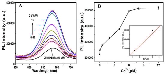 (A) fluorescence spectra of DMFN under different concentrations of Cd2+ and (B) plot of the photoluminescence (PL) intensity of the DMFN as a function of the Cd2+ concentration.