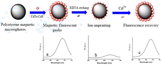 Based on the strong complexing action between EDTA and Cd2+ to produce the Cd2+-imprinted cavities in this experiment, imprinting of Cd2+ on the quantum surface on magnetic fluorescent microspheres could be realized, which created defects on the quantum surface and resulted in degraded fluorescence intensity, and the results are shown in curve b in Scheme 1. When additional cadmium ions were added in the system, they repaired the defects of the quantum dots on the microsphere surface automatically, so that the fluorescence was recovered. The results are shown by curve c in Scheme 1. Moreover, the fluorescence intensity was enhanced as Cd2+ concentration increased. A rapid, sensitive, and highly selective determination method of Cd2+ was established based on this off-on mechanism.