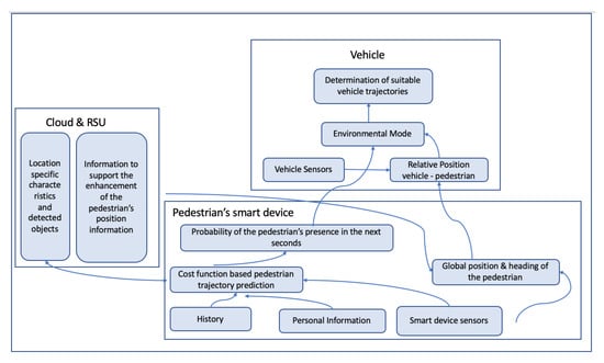 Vulnerable road users is a collective term used to describe cyclists, motorcyclists, moped riders and pedestrians. More specifically, in one of the studies presented, the number of accidents was predicted under the acceptance that no further successful measures including Intelligent Transport Systems (ITS) solutions were to be introduced within road transport systems. For these studies, the Community Road Accident database, CARE, was used. CARE is a European Commission database resource comprising detailed data of individual accidents, from the EU member states. According to this research, during the period 2002–2012, there was a significant decline in the number of accidents overall. However, the decline in Vulnerable Road Users’ (VRU) accidents is much less recorded, with bicycle and pedestrian casualties remaining relatively constant. This research predicted that the number of bicycle accidents was expected to increase while, by 2030, the number of VRU accidents will be almost comparable to those of car accidents since there is a significant decreasing rate of those accidents [1]. Due to the fact that the number of fatalities remains high and despite the recent advances in traffic safety, the United Nations have set as one of the first priorities to halve the number of deaths and injuries from road traffic accidents by 2020 [2] while the European Commission aims at reducing the number of fatalities in road transport to nearly zero by 2050. In this context, cooperative intelligent transport systems could play a significant role, since they utilize the coordination between different traffic agents such as vehicles and vulnerable road users. In such a scenario, vehicles and VRUs could exchange information in order to prevent dangerous traffic situations. This type of connectivity is even more important via the market penetration of vehicular communication systems and the increasing use of smartphones worldwide. More specifically, smartphones could play a vital role in the development of pedestrian to vehicle communication safety systems. By 2020, 6.1 billion smartphone users are expected globally. This equals 70% of the world’s population, showing the potential of this new information source [3], while in the last quarter of 2018, the total number of mobile subscriptions was around 5.9 billion [4]. Smart devices, with their included sensors and user interface, can provide information about the current movement state (velocity, acceleration and heading) and the position and characteristics of their users, such as age, gender and habits. On the other hand, sensors installed on vehicles could also provide information about the vehicle’s current position, direction and speed but also the driver’s intentions. The concept of Cooperative Intelligent Transportation Systems (C-ITS) is to combine measurements and information from vehicles, pedestrians and local infrastructure within a limited geographical area. Current applications within this area of interest are collision avoidance systems, emergency vehicle warning systems and traffic mitigation [5].