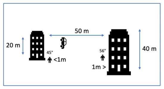 GPS is the most common global positioning technology, used to determine a three-dimensional ground location of any object. Although GPS when embedded in-vehicle navigation devices has been proved to be efficient, it has a number of shortcomings when used in pedestrian location-based services (LBS) [2]. GPS’s main drawback is low performance within “urban canyons”, places where direct lines of sight to the GPS satellites are obstructed from nearby buildings. In those situations, signals can reach the receiver after being reflected, usually many times, from nearby surfaces, known as multi-path signals [2,36]. The situation is even worse for pedestrians positioned on the pavement, close to tall buildings that obstruct the signals. Figure 5 displays the view of the sky based on proximity to buildings.