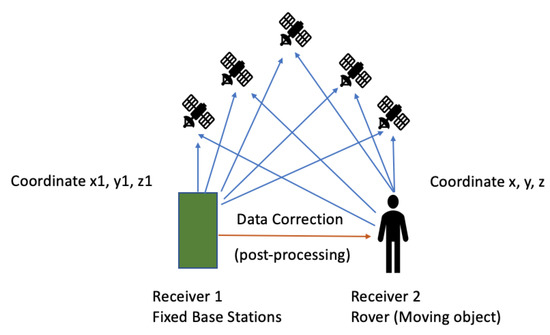 While in vehicles the GPS antennae are mounted in a place having a clear sky view, in pedestrians’ cases, smartphones are possibly in bags or pockets, resulting in signal deterioration. Moreover, GPS does not provide any ways to calculate VRU heading, which is essential for C-ITS targeting to VRU safety. Due to these reasons, additional services and sensors are required/already being used to improve VRU’s tracking [2]. Through the introduction of assisted GPS (A-GPS), the GPS receivers allow to retrieve information from network resources in order to combine them with the information received from the satellites and to thus improve location accuracy. Such systems are especially useful when the receiver is not easily reachable from satellite signals [37]. GPS-enabled smartphones are typically accurate to within a 4.9-m radius under open sky [38]. As mentioned in Reference [38], the best positional accuracy achieved was between 1 and 5 m (average error) under open sky conditions. In contrast, commercial-grade receivers with differential correction typically result in a positional error of less than 1 m [38]. Differential GPS, DGPS, is an enhancement to GPS, providing improved location accuracy from 1 to 3 m in the case of ideal implementations. DGPS combines the signals received from the satellites with those received from fixed ground-based reference stations in order to fix positioning errors. Proper digital correction signals are transmitted to all ground-based transmitters, which are called rovers. DGPS relies on two stations; one is the base station, and the next is a rover [39]. In a work developed in 2015, wheeled mobile robots were autonomously navigated and controlled. This incorporated self-localization, recovery and path planning [40]. The DGPS technique was used to develop the autonomous path following, Figure 6 illustrate how DGPS works, while the extender Kalman filter was applied to optimize the robot’s trajectory.