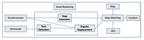 The authors tested the system within Sunken Garden in Williamsburg, US, by using anchor points as vertices and route segments as edges, while the ground truth of the anchor points was manually found from Google Maps. The test results proved that the system produced overall fewer errors than GPS location accuracy without however performing extremely better than pure GPS. In 2014, there was another research where a pedestrian dead reckoning algorithm was introduced by using data coming from smartphone sensors [49]. The proposed algorithm consists of step detection, stride length and heading estimation. The system’s architecture is depicted in Figure 8: