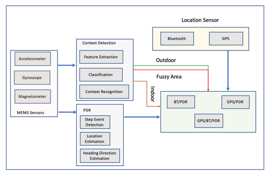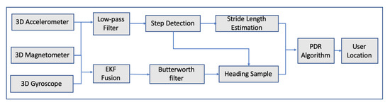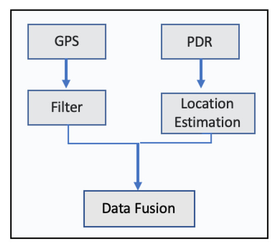 For the estimation of stride length, a back propagation neural network was developed, while the extended Kalman filter was applied to determine the user’s direction. The integration of gyroscope, accelerometer and magnetometer can improve user’s heading precision while the extended Kalman filter was used to merge all the sensor’s information in order to acquire accurate information on attitude angles. During testing, a commercial smartphone and data produced from its sensors, accelerometer, magnetometer and gyroscope were collected. For the stride length estimation, data from 5 different persons with different heights were used in order to examine the performance of stride length algorithm. As far as the heading estimation test, a building’s corridors were used to assess the performance of the heading estimation algorithm, while for the trace tracking, an actual walking trace was used. The results of stride length estimation were good enough; an average standard deviation of 0.03 m for each person was achieved. As far as the heading estimation, results were not satisfactory, while the trace tracking error, on average, was 5.83 for 10 different measurements coming from 10 different people. The authors pointed out that the optimization of the heading estimation algorithm could be an interesting work in the future. In 2017, another research was published, where a smartphone-based algorithm, integrating Pedestrian Dead Reckoning (PDR)/GPS/Bluetooth for pedestrian outdoor/indoor was proposed [50]. The authors pinpointed that sensors installed in smartphones are unstable due to the interference of external magnetic, large scale iron and steel equipment. For that reason, they proposed an algorithm utilizing data from gyroscope and magnetometer to improve the accuracy of heading direction.Figure 9 illustrates the system’s design, while the data fusion process is illustrated in Figure 10.