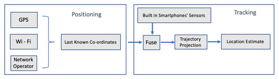 The authors of the research implemented and tested 3 different positioning algorithms. Two of them were based on the accumulation of the estimated stride lengths, along the horizontal orientation of the foot, while the third algorithm was based on the results of the ZUPT algorithm. After a study of more than 30 test trajectories (outdoor and indoor), the error between the final position estimation and the starting point in the majority of the cases were between 5 to 15 m [43]. In 2013, another research was carried out, where GPS and low-cost INS were integrated in order to enhance pedestrian’s outdoor navigation enhanced by surrounding buildings [46]. The authors pinpointed that the ZUPT method still produces heading errors, so they developed an algorithm by using the layout of the surrounding buildings and by smoothing the errors produced by the ZUPT algorithm using extended Kalman filter. The results showed the estimated position accuracy was below 5.3 m in a 40-min walk and about 0.15% of the total distance [46]. In 2013, a system named SmartLoc was presented, estimating car location and travel distance by leveraging inertial sensors embedded in smartphones; GPS signals; and automatically detected landmarks such as bridge, traffic, lights and driving patterns such as turning, uphill and downhill from inertial sensor data to improve the localization accuracy when the GPS signal was weak. The authors tested the system within the city of Chicago and an Android smartphone mounted to the car’s windshield. The authors drove for over 100 different road segments in downtown Chicago ranging from 1 km to 10 km and over 30 km on the highway. The system’s evaluation indicates the improvement in localization accuracy compared to GPS since the error was around 20 m for 90% of travel time while the mean error of GPS was 42.2 m. The system also proved that it can also reduce energy consumption by at least 10% for localization, if GPS is periodically being turned off when its signal weak without sacrificing localization accuracy [47]. The authors in Reference [42] pinpointed that it is necessary to map am object’s position onto a spatial map in order to develop a robust navigation system. The authors of this work integrated GPS signals and data coming from INS, while they applied Kalman filter and map matching in order to identify the right trajectory and to improve the matching navigation accuracy. Kalman filter was used to fusing the data coming from the sensors, such as accelerometer and gyroscope, while the map matching algorithm was used in order to reduce the GPS positioning errors. For testing purposes, GPS receiver and MEMs2 IMU3 were mounted on a motorcycle, while the tests was performed in Tainan City. In Reference [48], the authors presented a system, named APTS, for outdoor pedestrians with smartphones. This system used a robust dead reckoning algorithm and error-tolerant algorithm for map matching. In the case, the user walks with the smartphone, the dead reckoning algorithm monitors the user’s steps and walking direction, while the user’s position is being updated according to the map matching algorithm. In case the pedestrian’s location cannot be determined due to several available routes, GPS is used to eliminate ambiguity. Hence, the main purpose of GPS is to help distinguish between distant routes; therefore, GPS is used not often. The map information stores all possible routes of the user, and when a new step or turn is being recorded by the dead reckoning algorithm, the map matching algorithm updates the pedestrian’s location. Figure 7 depicts the system’s flow.