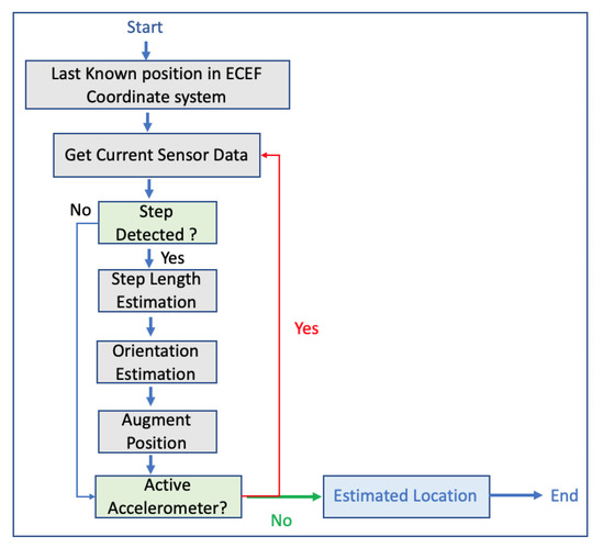 For the tests, the authors used a commercial smartphone and 2 people participated in the tests. During the experiment, the smartphone is held in hand and the x-axis of the phone is along the forward direction [50]. The best outdoor localization results produced where 5 m per 100 of walking distance, while the heading direction algorithm produced localization results with an error of 3 m in 70% of the test period. The authors pointed out that, in their research, they did not consider the change in height. In 2018, another research was published presenting a hybrid location estimation solution, combining GPS, pedestrian dead reckoning and a Cell-id based Trilateration algorithm (CbT) [51]. The proposed model involves two parts. The first is the static part, where the user’s position is obtained through any of the GPS, Wi-Fi or Cell-id. The second, the dynamic part, is where the user’s trajectory projection is generated via a PDR system. The Figure 11 depicts the proposed solution, while Figure 12 illustrates the proposed PDR.