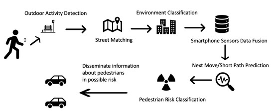 - Street Matching is being carried out in order to determine whether the user is near a street by matching his/her location against a map. Based on Reference [21], where the authors have applied map matching techniques for vehicles [58,59], a similar approach could be developed to identify on which street the pedestrian is walking.