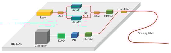 Experimental configuration of HD-DAS system. OC, optical coupler; AOM, acousto-optic modulator; DF, delay fiber; EDFA, Erbium-doped fiber amplifier; PD, photo detector; DAQ, data acquisition card.