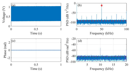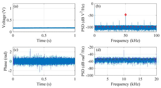 Figure 4 summarizes the results from channel 163, in which Figure 4a is the collected intensity signal and Figure 4b is its PSD. The 1 s time duration is chosen as a compromise between negligible time-dependent effect of RMS and the sufficient frequency resolution to resolve the PSD value at the heterodyne frequency. The red dashed line in Figure 4b marks the noise floor (estimated as the averaged PSD value from 1 kHz to 49 kHz) and the red diamond marks the PSD value at the heterodyne frequency , i.e., 50 kHz. The resultant relative PSD at the heterodyne frequency is = 80.4 dB defined as the difference between the PSD at (−12.2 dB V/Hz) and the noise floor (−92.6 dB V/Hz). Figure 4c plots the demodulated phase signal along with its PSD shown in Figure 4d. The corresponding noise floor, calculated as the averaged PSD value from 100 Hz to 20 kHz, is −83.5 dB rad/Hz. The visible peak at 10 kHz (as well as the harmonics in Figure 4b) is caused by the unavoidable switching effect in the AOM pulse modulator.