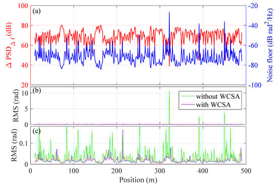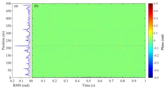 We then follow the aforementioned procedure to re-demodulate the signal in Figure 3. The result is given in Figure 9. Here, the number of channels for stacking is M = 4, which is the optimal stacking number for our data set. Figure 9a shows the RMS of the phase signal over position and the standard deviation of the RMS is 0.15 rad, achieving a noise reduction of 13.7 dB compared to the results in Figure 3 (also see Figure 6b,c for a direct comparison over position). Note that the increase of noise in some channels (e.g., 220 m) may be induced by the noise in adjacent channels after applying WSCA; the overall effect of noise suppression, however, is clear.