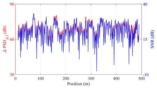 where and are the power level of signal and noise, respectively, represents the power spectrum density of the intensity signal. and are the considered frequency range of signal and noise, respectively. In the calculation, the bandwidth of signal is with the rest considered as noise. As can be seen from Figure 7, the relative PSD at the heterodyne frequency is strongly linked with the SNR (with the estimated cross-correlation coefficient of ∼0.98). This is reasonable since the relative PSD at heterodyne frequency is the difference between the PSD at and the noise floor. In Gabai’s work [22], it has been found that the SNR of the demodulated phase was directly proportional to the SNR of the backscattered trace. According to Equation (2), the higher the noise floor, the lower the SNR of the demodulated phase, explaining the negative relation between the relative PSD at heterodyne frequency and the noise floor.