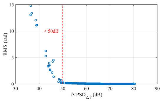 Figure 6c shows the RMS value, i.e., the effective amplitude, of the detected phase change over position. It can be seen that, in certain channels, the RMS increases sharply due to the phase fading noises. Figure 8 displays the RMS of the detected phase versus the relative PSD at heterodyne frequency. These data were calculated from a 10-s continuously measured signal. It can be seen that the RMS value increases sharply when the relative PSD at heterodyne frequency is lower than 50 dB (red dashed line).