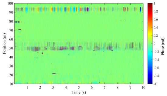 Figure 11 displays the waterfall plot of the retrieved phase signal from the improved HD-DAS system (thus with WCSA algorithm applied). Two sets of vibration signals are visible in the figure: one is located at position 50 m, which is the noise-induced phase change; the other at 92 m represents the music-induced phase change. The gauge length can be calculated as , which is 8 m in this case. This is in accordance with the length of signal span in the waterfall plot. Note that the noise source is set far away from the music player and whose effect on the music-induced phase signal is negligible.