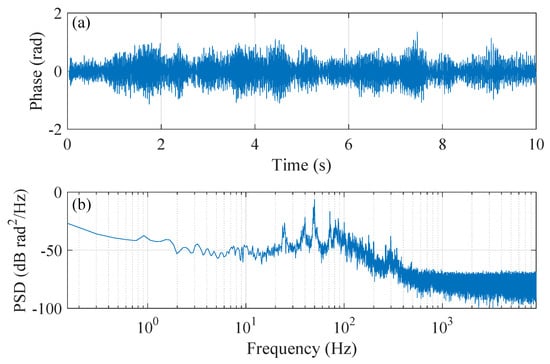 Plot of (a) the demodulated phase signal located at position 50 m and (b) its PSD.