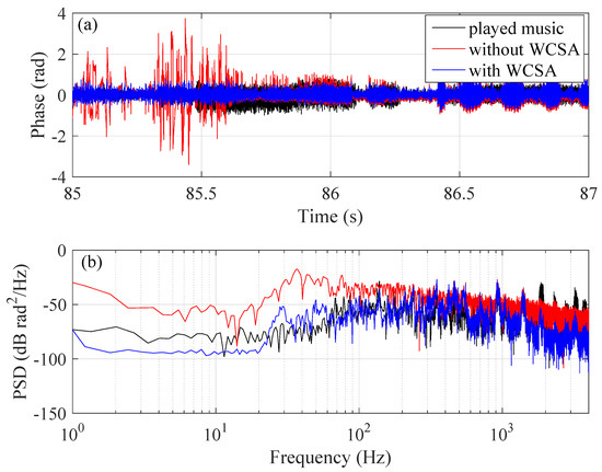 As a direct comparison, in Figure 14a, we plot the retrieved sound signal from time 85 s to 87 s without (red) and with (blue) WCSA applied, overlapped with the original waveform (black). As can be seen, without WCSA, the retrieved signal shows fatal distortions due to a phase fading effect. Under this circumstance, the PSD of the retrieved phase (shown in Figure 14b) appears significant deviation from that of the original data (especially at low frequency range). On the other hand, when WCSA is used, the PSD of the retrieved phase coincides very well with that of the applied sound.