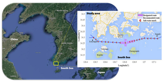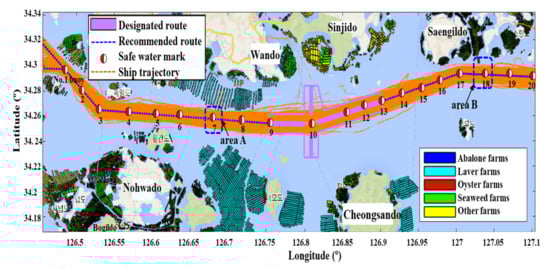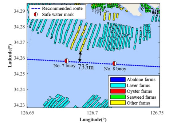In this figure is shown the traffic route in the waters near Wando between Eoryongdo and Seopdo for safe vessel navigation. To clarify the traffic route, there are twenty-one safe watermarks with red and white longitudinal lines in the east-west direction [28,29]. It is necessary to navigate to the starboard side of the traffic route [30]. It is specified not to deviate from the traffic route to prevent damage to the farms distributed along the starboard side of the direction of a course.