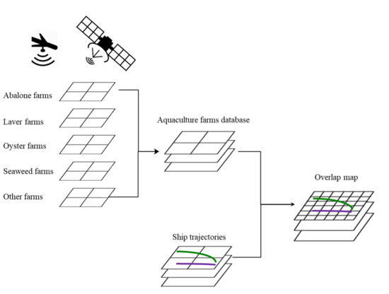 This figure illustrates the overlay map with the mentioned aquaculture farms and the vessel trajectories that result from the distribution of these farms and the monthly AIS trajectories of the vessels navigating the traffic route. The distribution of the aquaculture farms is represented by different colors (abalone—blue, laver—oak, oyster—red, seaweed—green, others—yellow).