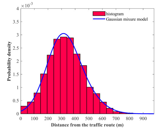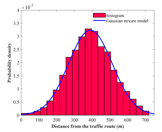 Finally, Figure 6 and Figure 7 show the histogram and the fitted GMM based on the calculated lateral distance for areas A and B. The horizontal axis represents the lateral distance from the traffic route to the aquaculture farms, and the vertical axis represents the probability density.