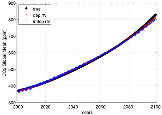 Comparison between the model global and monthly mean CO2 concentration (black dots) with two types of global and monthly mean CO2 concentration retrievals, derived from a dependent (red dots) and independent (blue dots) regression training set.