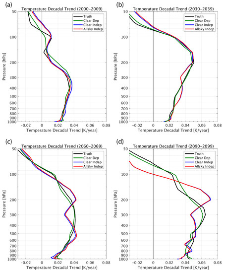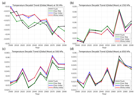 Examples of comparisons between decadal trends (K/year) produced by a 100-year climate model simulation for four atmospheric levels: (a) 50 hPa, (b) 250 hPa, (c) 500 hPa, (d) 850 hPa. The “Truth” (black curve) decadal trends throughout the twenty-first century are compared with those retrieved from simulated hyperspectral infrared radiance measurements, assuming: clear-sky conditions using a linear regression model trained with the climate model-produced atmospheric conditions (Clear Dep, green curve); clear-sky conditions using a linear regression model trained with contemporary global weather observation atmospheric conditions (Clear Indep, blue curve); and all-sky conditions using a linear regression model trained with contemporary global weather observation atmospheric conditions (All-sky Indep, red curve).
