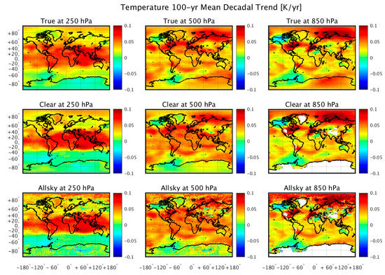 Examples of comparisons between the 100-year regional trends in atmospheric temperature (K/year) produced by a climate model simulation (top row) with 100-year trends throughout the twenty-first century retrieved from simulated CLARREO spectral infrared radiance measurements, assuming: clear-sky conditions using a linear regression model trained with contemporary global weather observation atmospheric conditions (middle row); and all-sky conditions using a linear regression model trained with contemporary global weather observation atmospheric conditions (bottom row). These results demonstrate the ability to retrieve regional temperature trend information when averaging over the full 100-year period.