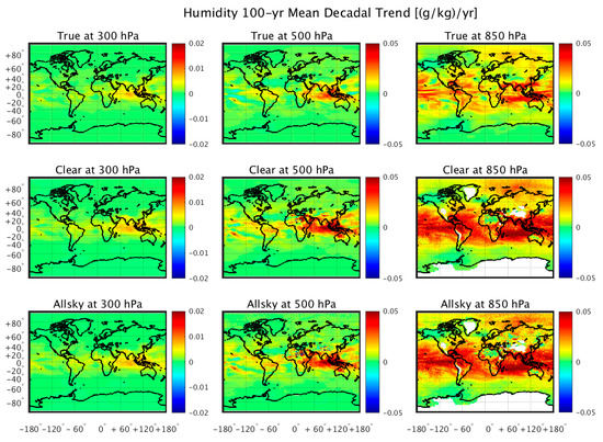 100-year regional trends of absolute humidity (g/kg/year) compared similarly to the temperature comparisons of Figure 4. These results demonstrate the ability to get useful regional information from the retrieval of atmospheric humidity.