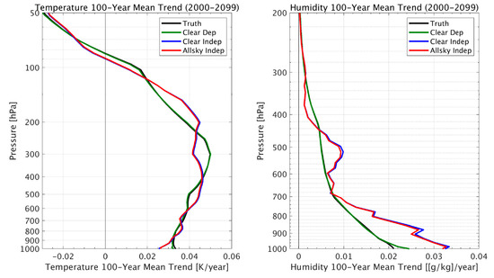 Figure 4 and Figure 5 show the regional 100-year trends in temperature and humidity, respectively. One can see that the geographical distribution of the temperature and moisture trends are retrieved from the simulated radiance data, with the possible exception of places with a relatively steep terrain (e.g., Greenland). The retrieval results obtained using the “dependent” training database are not shown, because they are virtually identical to the “truth”, as was also shown in Figure 2 and Figure 3. Although it can be seen that clouds introduce white noise within these regional trend patterns, especially for temperature, it is shown in Figure 6 that because this noise is spatially random, it tends to average out when producing the global mean trend values. It is also seen from Figure 6 that there is a relatively large vertically biased training sample dependence upon the retrieved moisture profile trends that does not result for the retrieved temperature profile trends. This may be a consequence of the nonlinear dependence of the variations of radiance with respect to the variations in specific humidity not completely accounted for by the cloud height classification process.