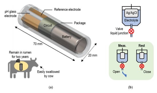 In recent years, pH monitoring of a cow’s rumen has become increasingly important in the livestock industry because real-time pH monitoring can prevent a deadly disease called rumen acidosis. Rumen acidosis is caused by rapidly digestible carbohydrates for stable production of rich milk and marbled beef that contains a large amount of fat. When a cow suffers from rumen acidosis, the pH of the cow’s rumen decreases from approximately 7.0 to below 5.5. If the pH decrease can be detected at an early stage, administration of pH adjustment medicine will prevent serious condition []. Therefore, wireless pH sensors for cows’ rumen have been developed over the past ten years as a simple method of real-time pH monitoring [,,,,]. We are also developing a rumen pH sensor shown in Figure 1. The size of the sensor is designed to be easily swallowed and remain in the rumen.