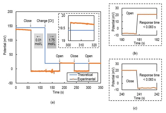 Even when the liquid junction was closed and then opened, a potential corresponding to the concentration was shown. The error from the theoretical value after switching was 0.5 mV or less. The response time was less than 0.083 s according to Figure 2b,c both at opening and at closing. The response time was less than 0.083 s even if the concentration of the KCl changed. Since this value is defined by the time resolution of the source meter, it should be noted that the actual response time may be smaller.