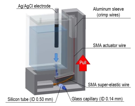 A design of the VAIRE using shape memory alloy (SMA) is shown in Figure 3. A bare Ag/AgCl electrode is immersed in a saturated KCl solution, and it flows out through a liquid junction. An SMA valve is attached to the liquid junction. Lead wires omitted in Figure 3 are connected to an SMA actuator wire.